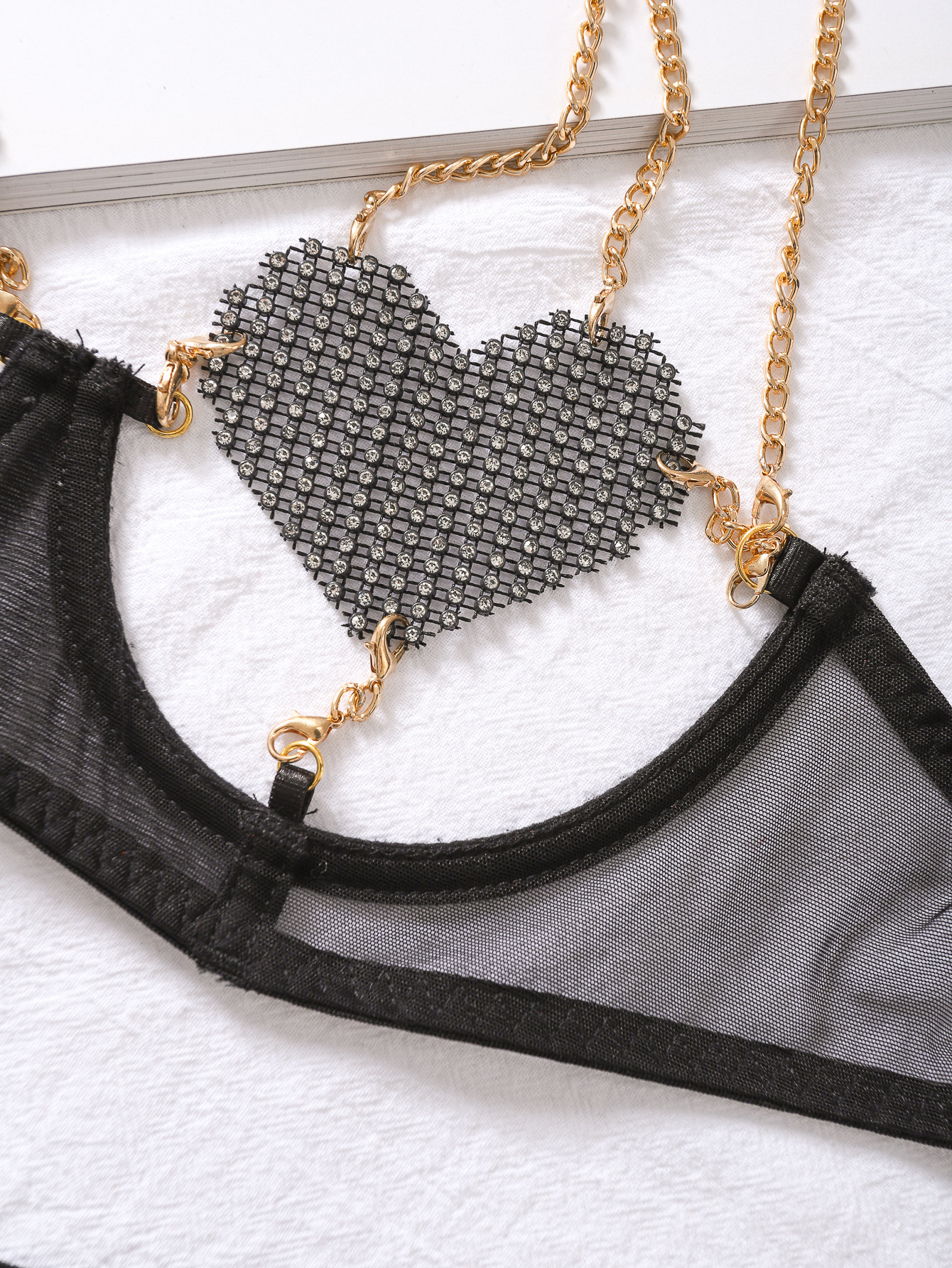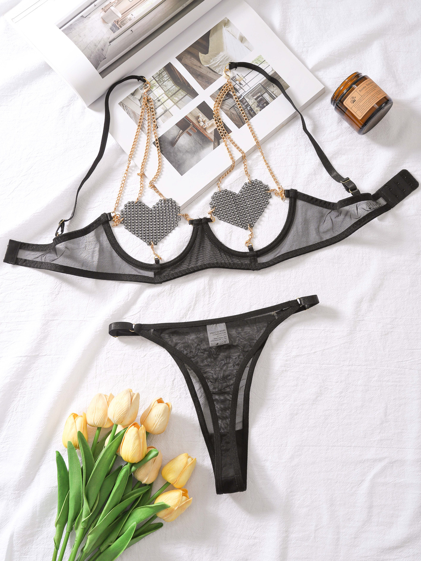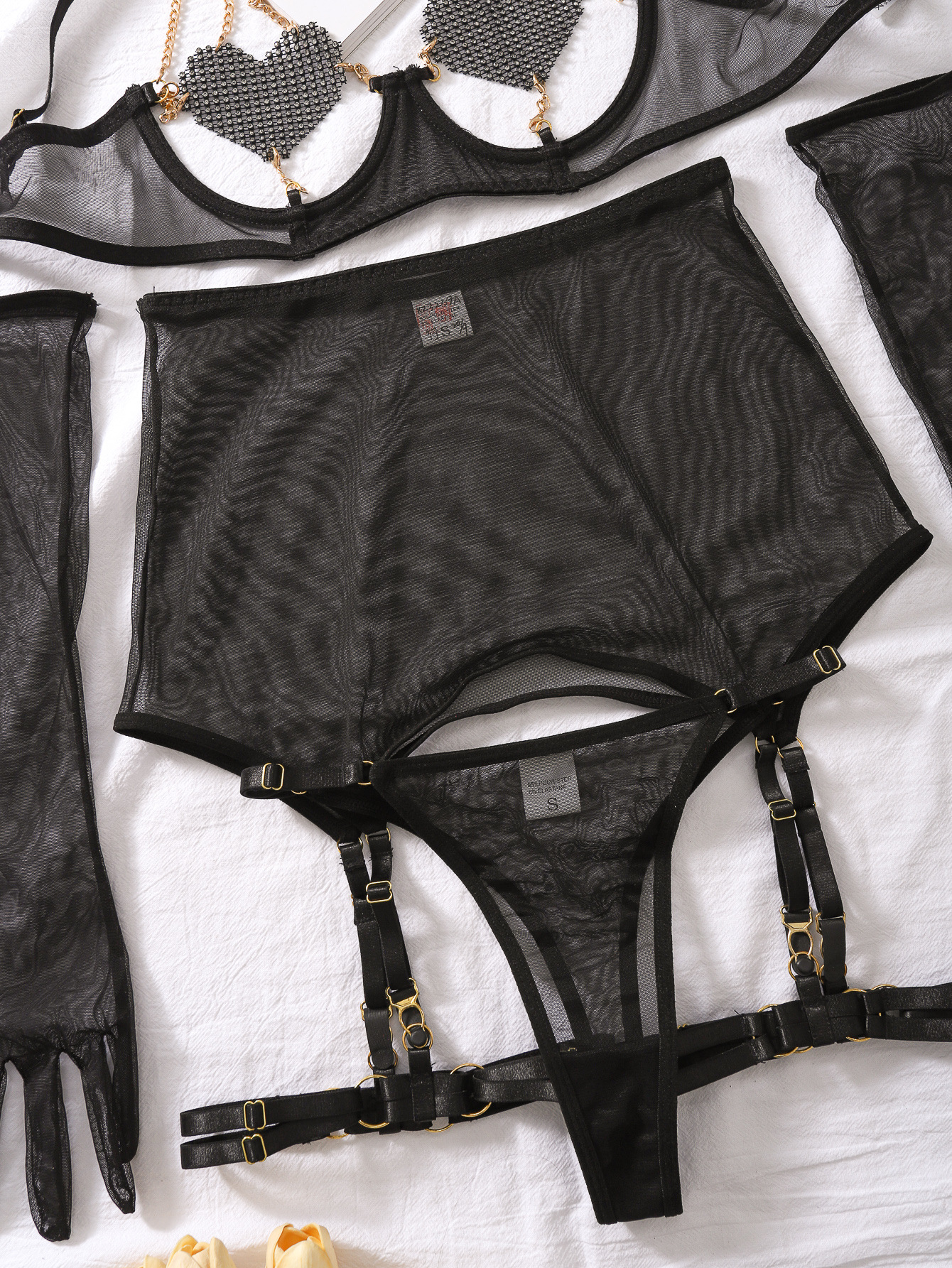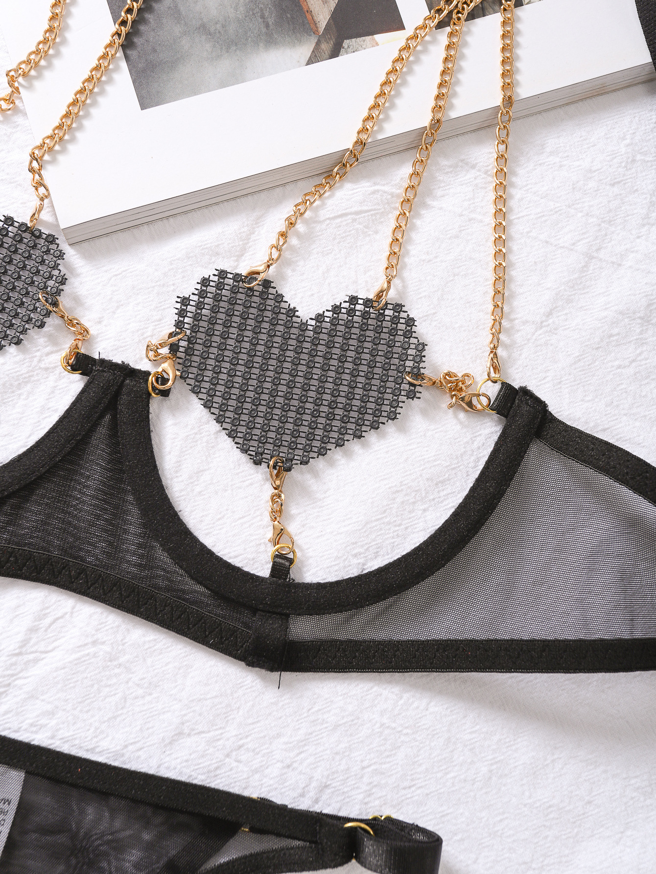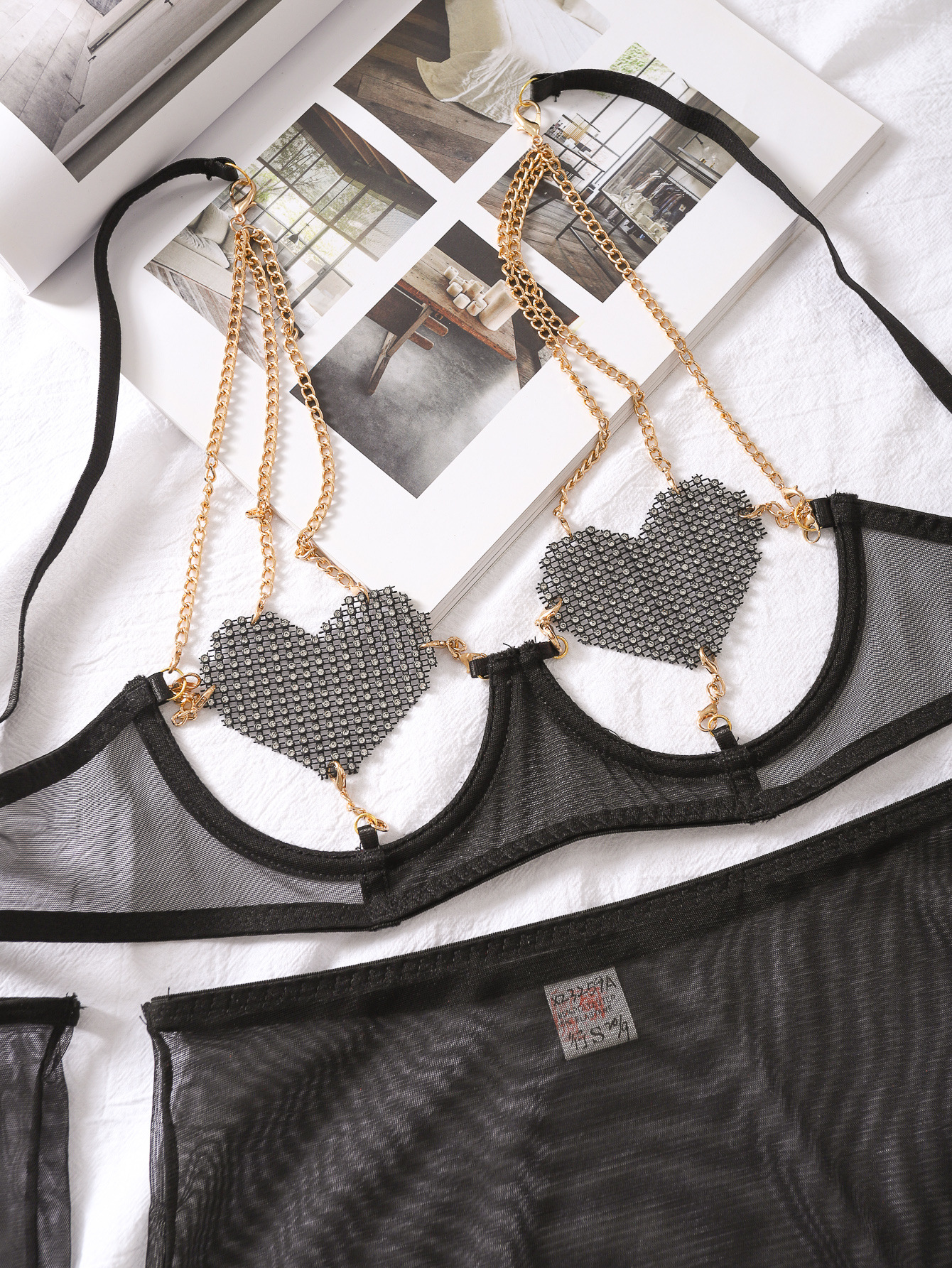 Internet celebrity lingerie breast love chain sexy perspective mesh five-piece female